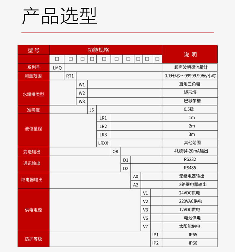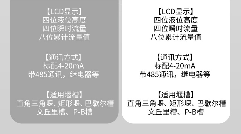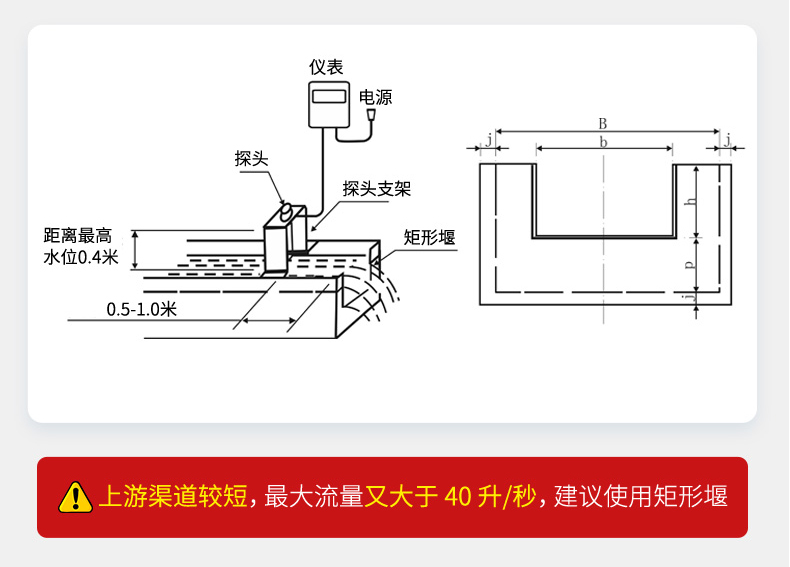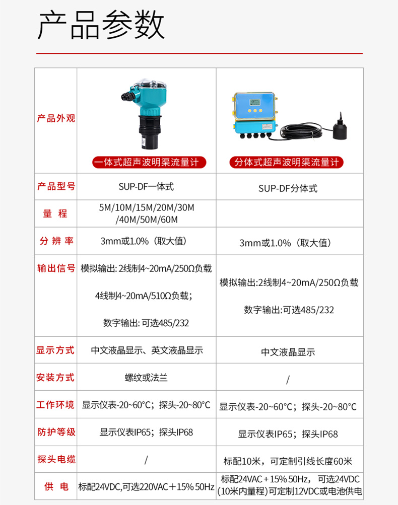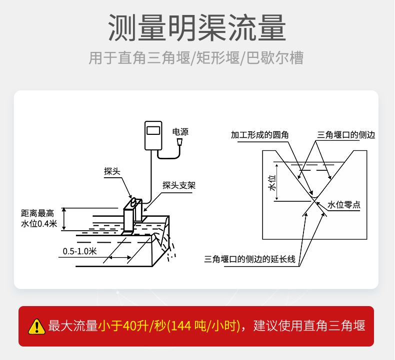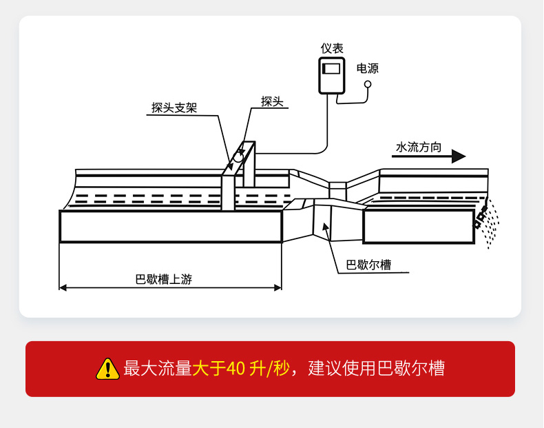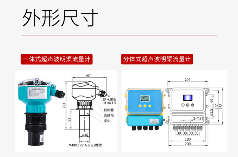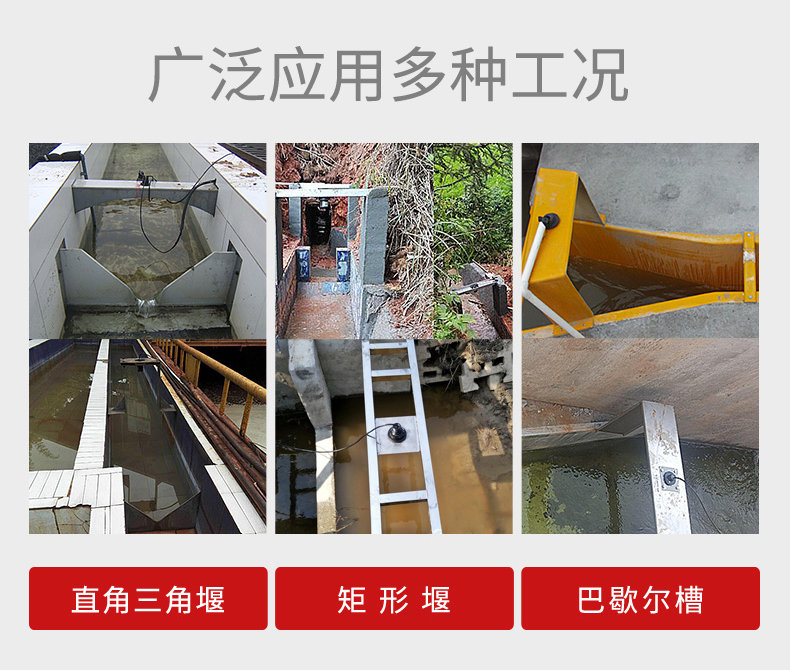 产品描述:超声波明渠流量计与量水堰槽配合使用,测量明渠内水的流量。主 要用于测量污水厂、企事业单位的污水排放口、城市下水道的流量及农 田水利中的渠道等。