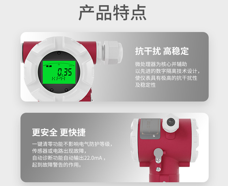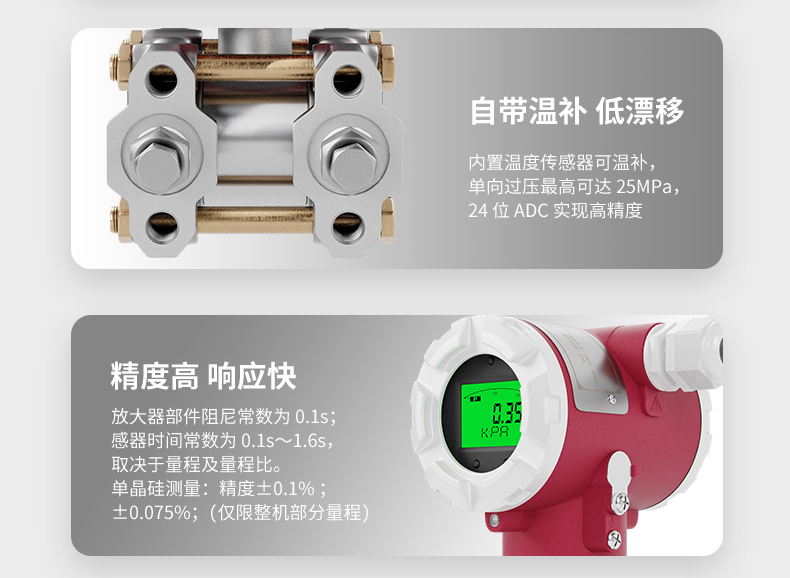 产品描述:智能差压变送器是采用高精度硅传感器技术,新型智能高精度变送器,基于通过微处理器的电子部件,实现与现场设备通信。 差压变送器包括差压、高静压差压等多个品种。广泛应用于石油、化工、电力、冶金、水务、酿造等工业领域。