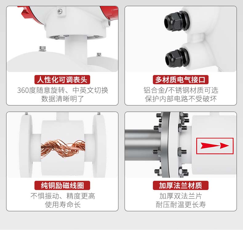 产品描述:电磁流量计基于法拉第电磁感应原理设计,用于直接测量封闭管道内导电液体的瞬时流量,并具有流量累积功能。在进行现场监测显示的同时,可输出标准的电流信号、脉冲信号和 RS485 数字信号,供记录、调节、控制使用,实现检测自动控制。可广泛应用于自来水、化工、煤炭、环保、轻纺、冶金、造纸等行业。