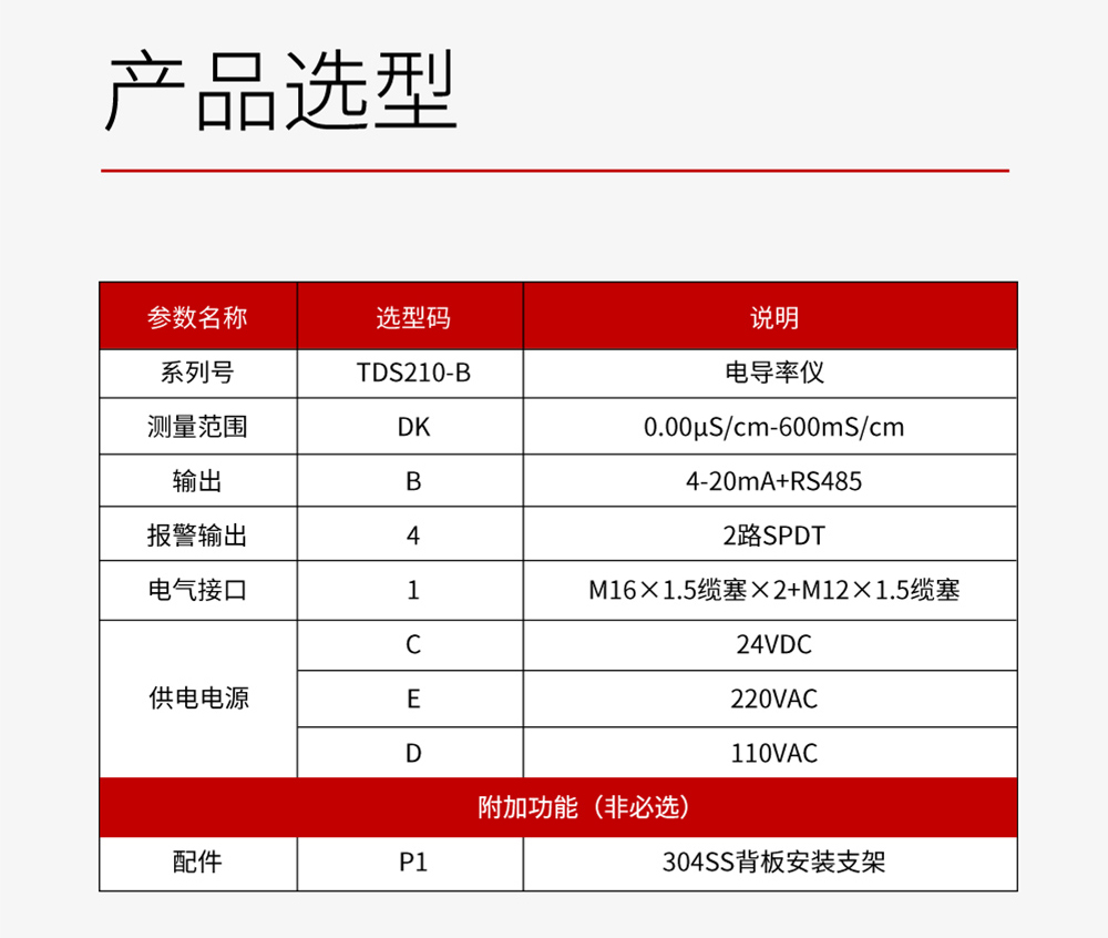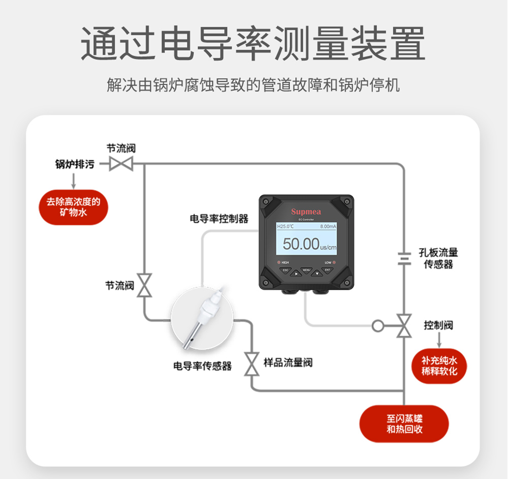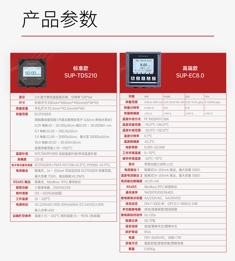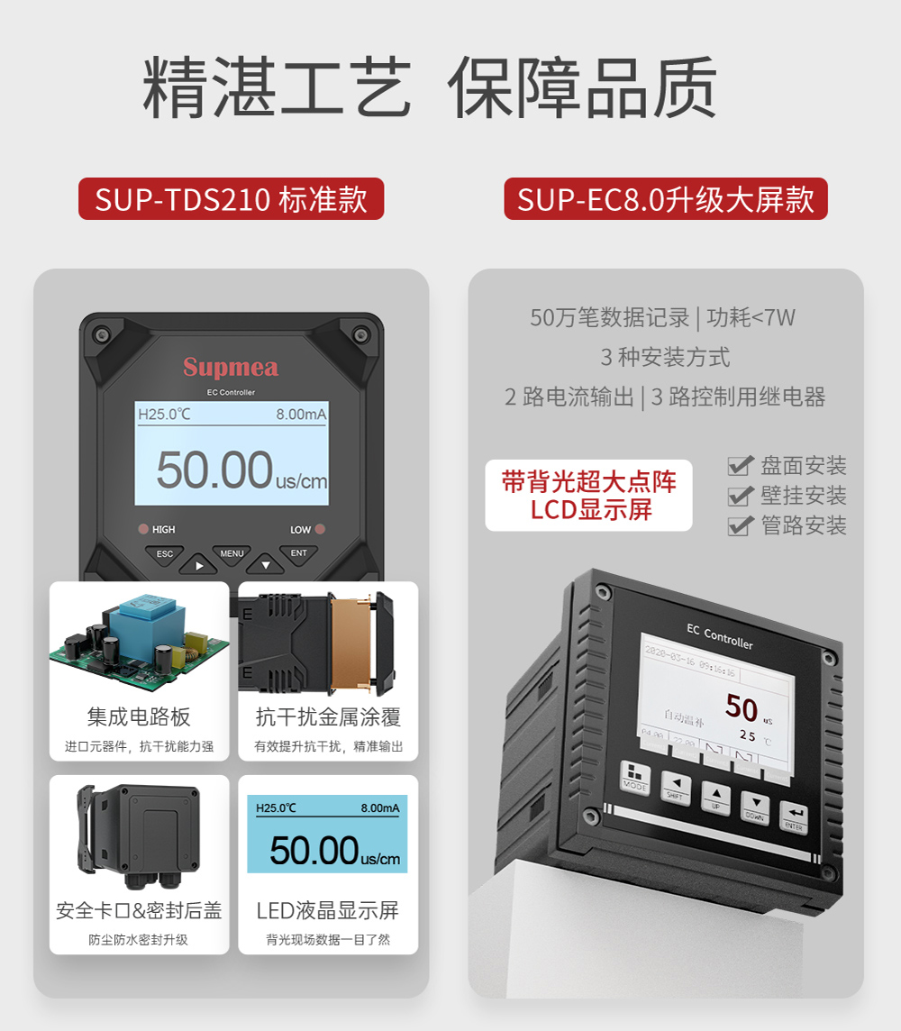 产品描述:SUP-TDS210-C工业电导率仪表,广泛应用于火电、化工化肥、冶金、环保、制药、生 化、食品和自来水等行业。控制器主要对溶液中的电导率/总溶解固体/ 电阻率和温度进行连续监测。