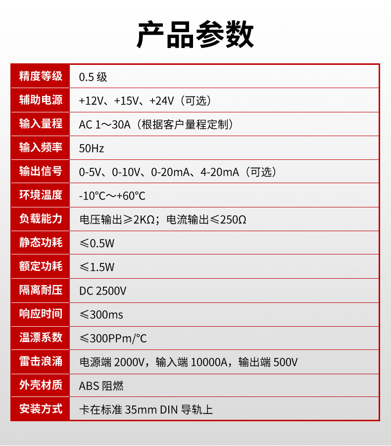 产品描述:穿孔式交流变送器是一种将被测交流参信号转换成直流电流、直流电压并隔离输出模拟信号或数字信号的装置。采用新型电磁隔离,24V辅助供电三重隔离标准,穿孔式安装标准导轨和螺钉安装,安全可靠。