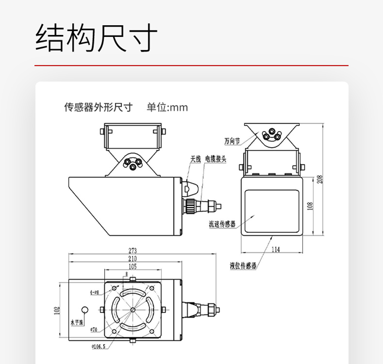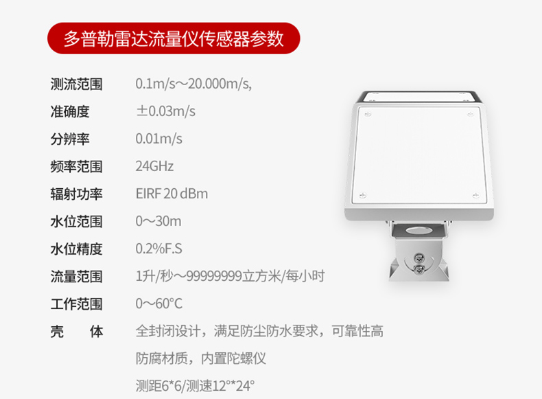 产品描述:本款雷达多普勒流量计是在自然水域中测量水的流速、水位的仪表。测距雷达单元工作频率为 80GHz,测速雷达单元工作频率为 24GHz。测量点在机体前方,不破坏流场,适用于泥沙悬浮物含量高、水草等漂浮物多和极其严苛的冰期场合的河流中测量。可广泛适用于水位测站灌溉支渠、污雨水管网等流量监测。-CN1