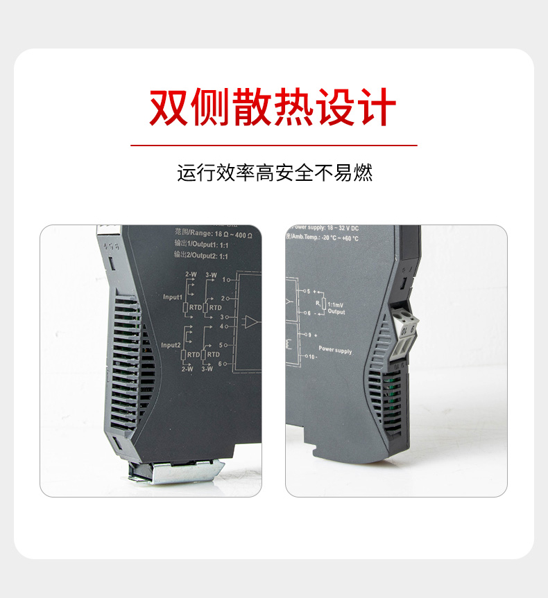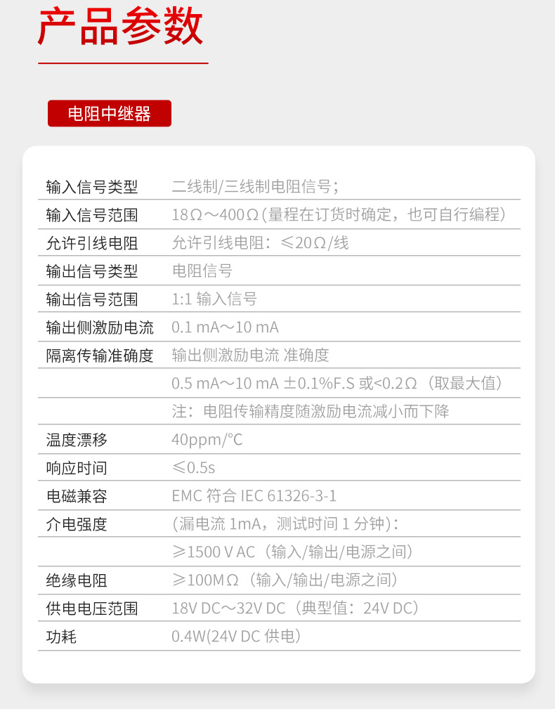 产品描述:输入电阻信号,经过隔离 1:1 输出。输入端、输出端及电源端三端隔离。本产品为智能化设计,具备传统产品所不具备的多种功能。内部采用了数字化调校、无电位器、自动零点校准等先进技术。可与各类仪表及 DCS、PLC 配套使用
