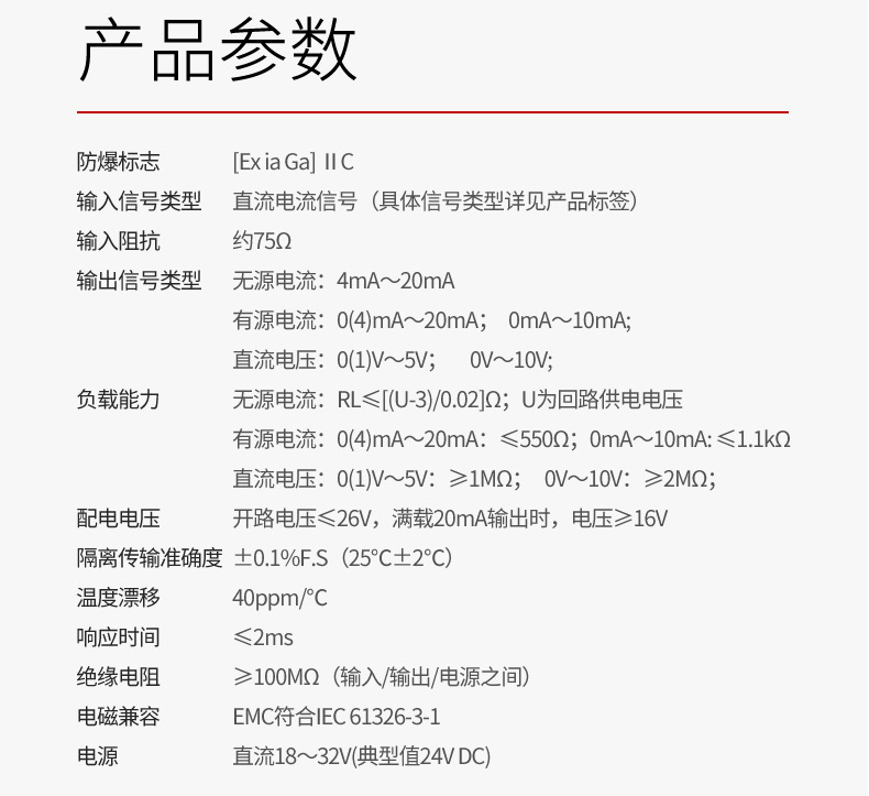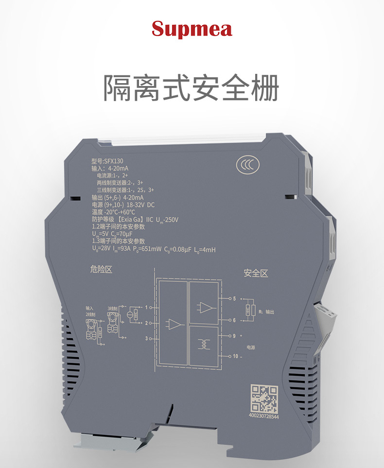 产品描述:隔离式安全栅向危险区的变送器提供隔离的工作电源,同时检测回路中的电流,经隔离变送输出电流或电压信号到安全区。