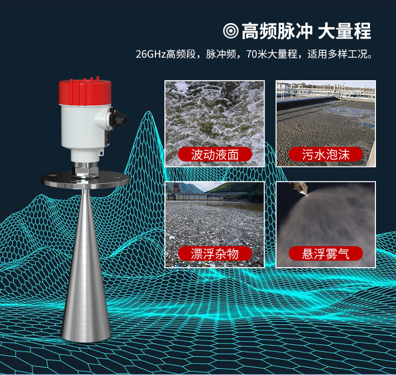 产品描述:90 系列传感器是 26G 高频雷达式物位测量仪表,测量最大距离可达 80 米。天线被进一步优化处理,新型快速的微处理器可以进行更高速率 的信号分析处理,使得仪表可以用于各种强腐蚀性液体的测量。CN5