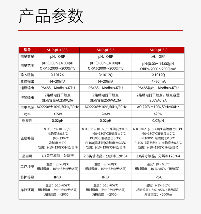 产品描述:SUP-pH6.5型工业pH计,是一款智能在线化学分析仪器,广泛应用于火电、化工化肥、冶金、环保、制药、生化、食品和自来水等行业,对溶液中pH 值或 ORP 值和温度连续监测。连续监测数据通过变送输出连接记录仪实现远传监控与记录,也可以连接 RS485 接口通过 Modbus-RTU 协议与计算机通讯,从而实现计算机对仪表监控与记录。