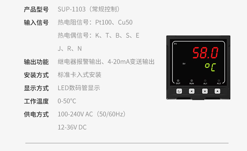 产品描述:美仪SUP-1103三位单回路数字显示控制仪采用模块化结构、操作方便、性价比高,适用于轻工机械、烘箱、实验设备、加热/冷却等控温范围在 0~999℃的对象。仪表采用双排三位数码管显示,具有多种热电阻、热电偶输入信号类型可选,测量精度为 0.3%;5 款外型尺寸可选、支持 2 路报警功能,带变送输出功能。输入端、输出端、电源端光电隔离,100-240VAC/DC 或 12-36V DC 开关电源供电,标准卡入式安装,工作环境温度在 0-50℃,且相对湿度 5-85%RH(无凝结)。