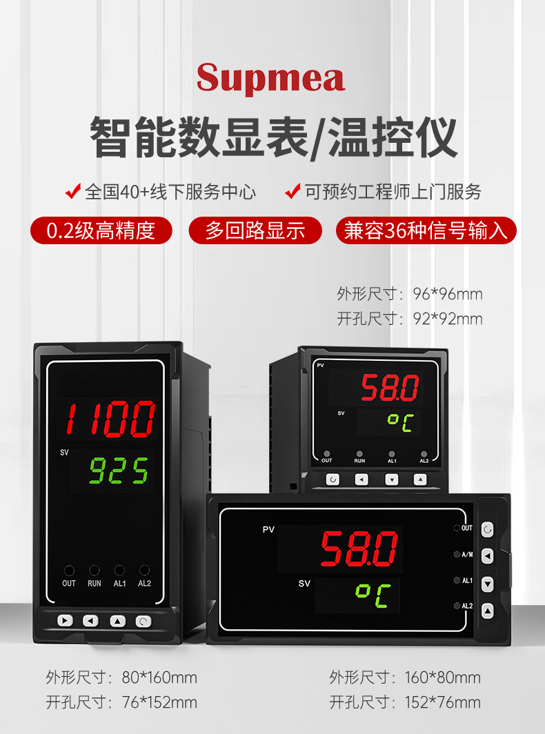 产品描述:美仪SUP-2200双回路数字显示控制仪采用了表面贴装工艺,全自动贴片机生产,具有很强的抗干扰能力。本仪表支持多种信号类型输入,可与各类传感器、变送器配套使用,实现对温度、压力、液位、速度、力等物理的测量显示,带报警控制、模拟变送输出、485/232 通讯等输出功能,带双屏数码管显示,可自由设定上、下窗口显示内容,可订制数学运算功能,可针对两路测量信号进行加、减、乘、除运算,其适用范围非常广泛。