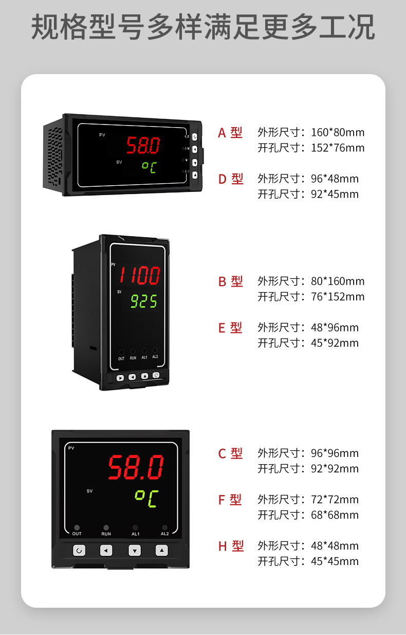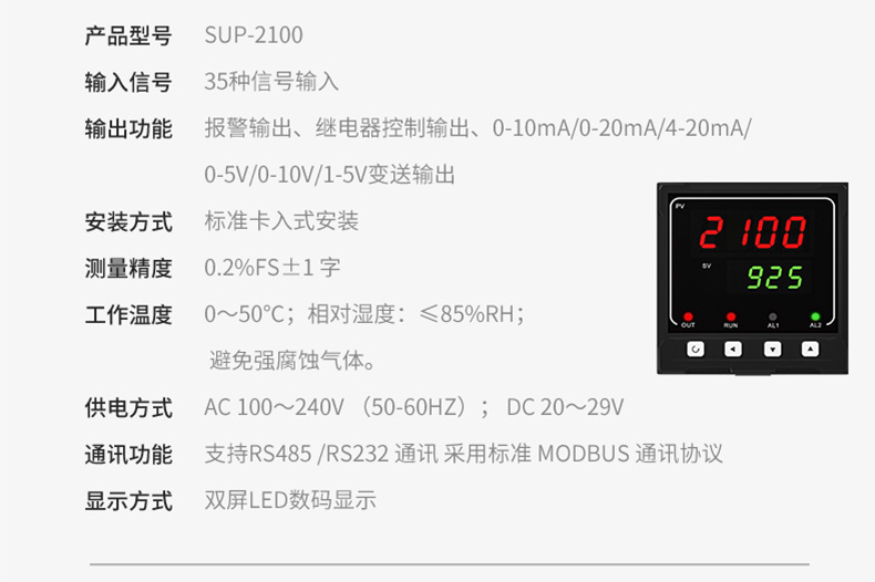 产品描述:美仪SUP-2100单回路数字显示控制仪采用全自动贴片封装工艺,具有很强的抗干扰能力。设计了双屏 LED 数码显示,显示内容更丰富。可与各类传感器、变送器配合使用,实现对温度、压力、液位、速度、力等物理量的测量显示,输出功能包括:报警控制、模拟变送、485/232 通讯等等,比传统的数显仪表还新增加了还原出厂默认参数,操作更简便,适用更广泛。