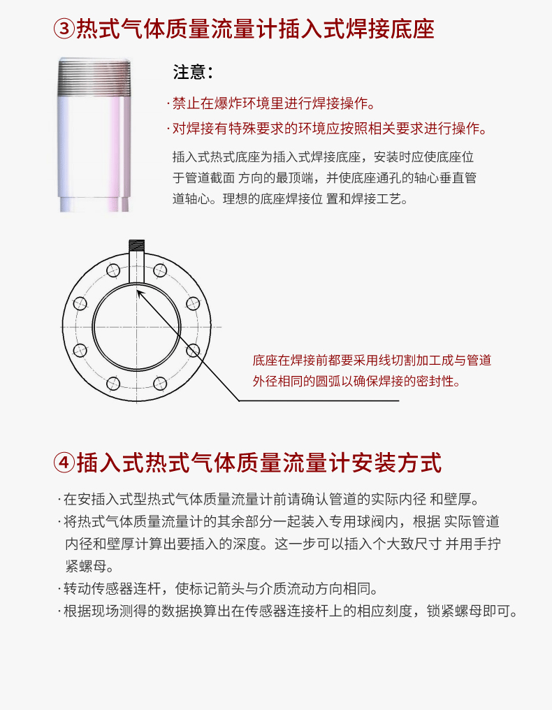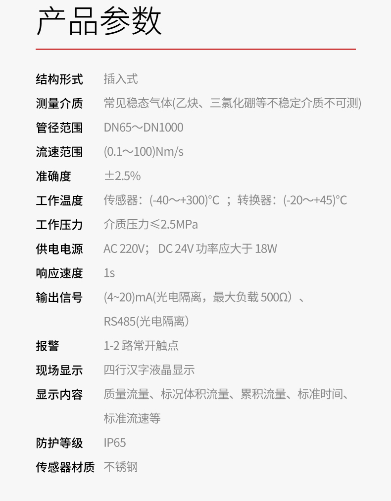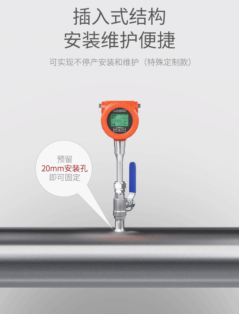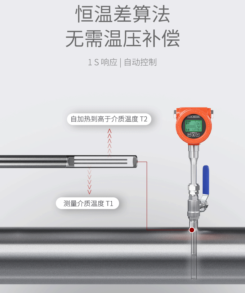 产品描述:热式气体质量流量计是基于热扩散原理而设计的,该仪表采用恒温 差法对气体进行准确测量。具有体积小、数字化程度高、安装方便,测量准确等优点。