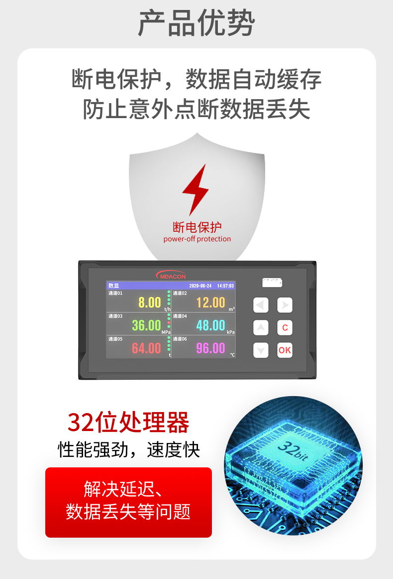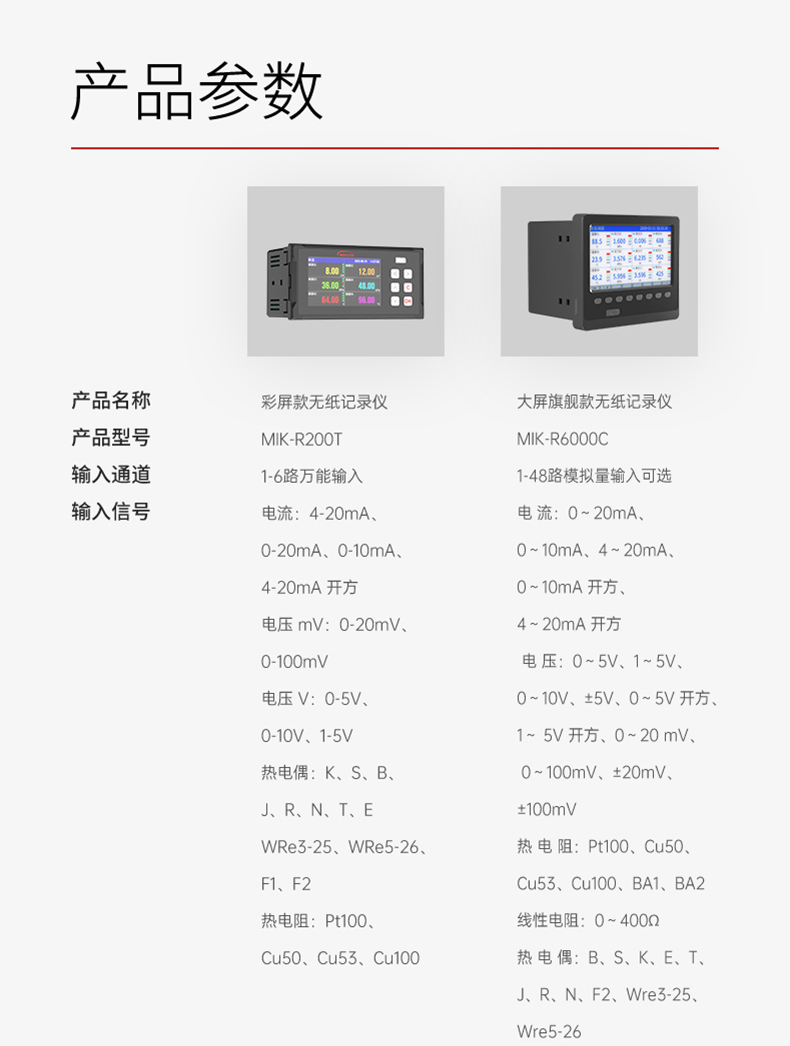 产品描述:工业无纸记录仪,6 通道万能输入,160*80 面板尺寸。可输入电流、电压、热电偶、热电阻和频率等工业信号,以数值、棒和曲线形式实时显示数据,定时将数据存储于仪表内部电子存储器,可通过 USB 设备快速转存历史数据。