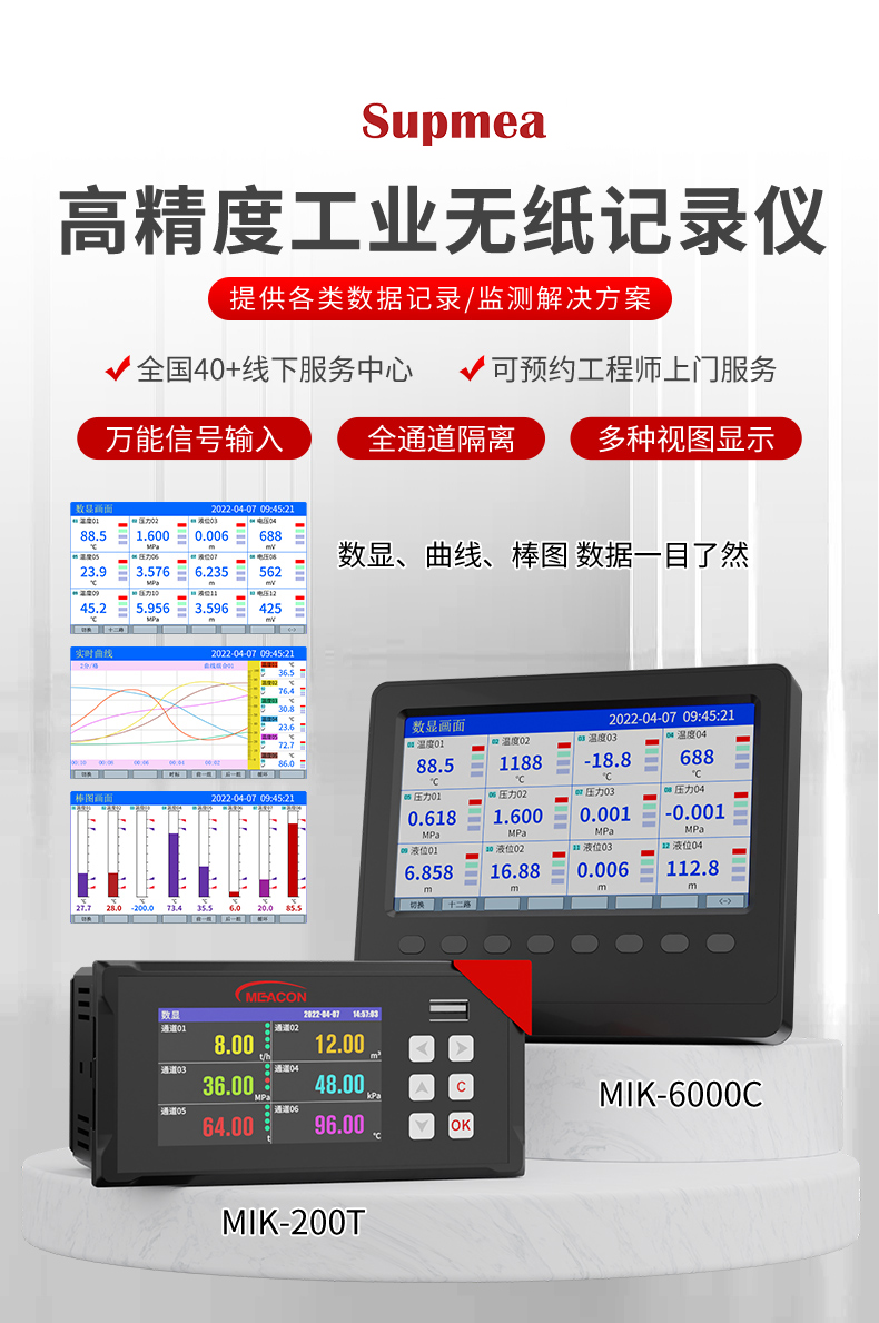 产品名称:美仪_SUP-R200T_1~6路可选_记录仪温度/压力/电流/电压/频率等多种参数