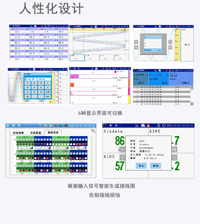 产品描述:触摸式彩色无纸记录仪具有 60 个运算函数、24 路模拟量输入、3 路 开关量输入、3 路脉冲量输入、6 路模拟量变送输出、16 路开关量输出, 可实现运算、显示、记录、报警、分析统计报表、高速采样等功能,通 过 RS-232/RS-485 和以太网通讯接口,可实现远程实时监控、组态管理、 历史数据读取等功能,通过 U 盘可实现组态管理、监控画面管理和历史 数据管理等功能。