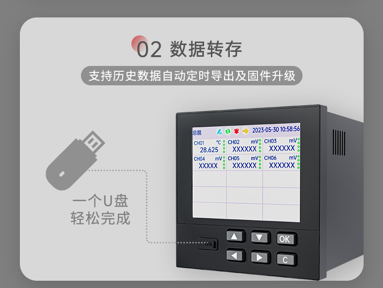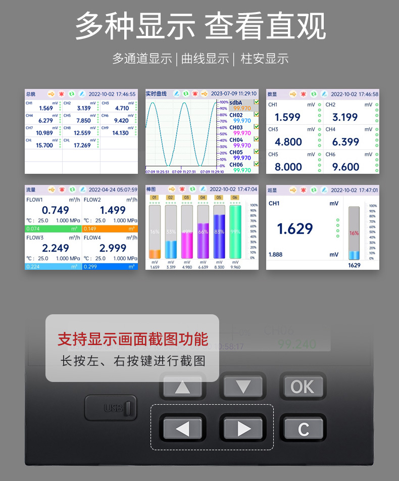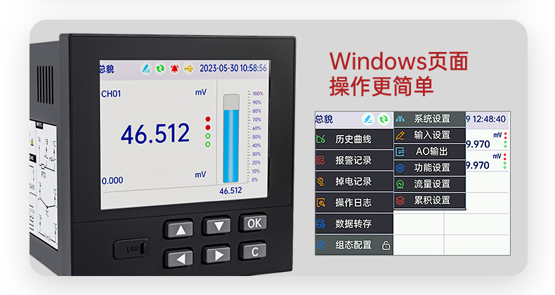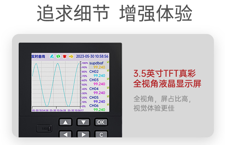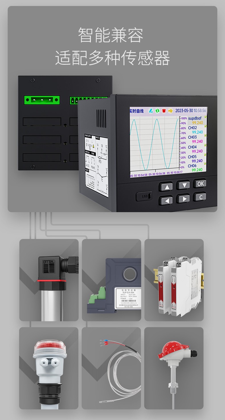 产品描述:本产品为工业无纸记录仪,配置 3.5 英寸 TFT 真彩全视角液晶显示屏。可以接入多种类型的电流、电压、热电偶和热电阻等工业标准信号,实现温度、湿度、压力、液位、流量的显示、记录、超限监控、报表、数据通讯、信号变送以及流量累积、流量温压补偿等功能。可应用在冶金、石油、化工、建材、造纸、电力、食品、制药、工业水处理等各个行业。