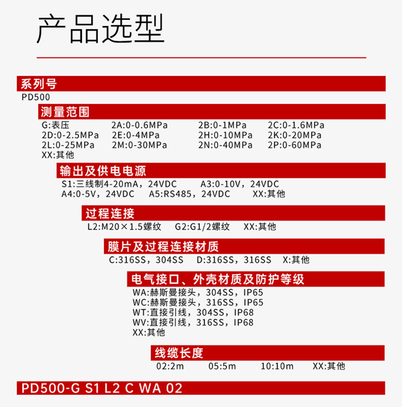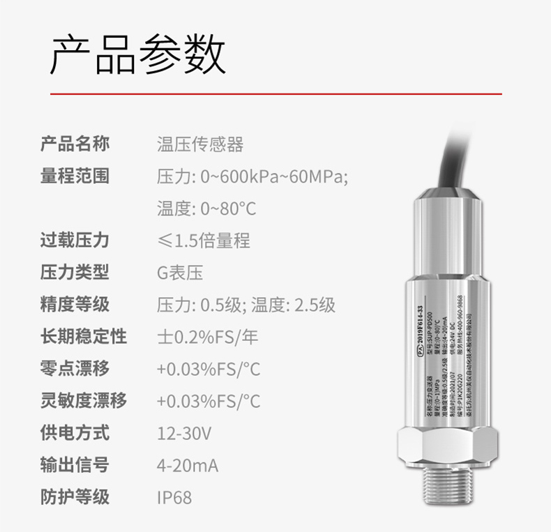 产品描述:温压一体变送器是集压力、温度一体测量的变送器。 选用高可靠硅压阻压力传感器、热电阻等作为核心元件, 经过温度补偿、数字电路修正和信号调理,输出标准的 工业信号。产品都经过精心设计、元器件筛选、工艺验 证固化、循环加载老炼、环境模拟测试等过程,保障每 只产品稳定可靠。 温压一体变送器以其优良的准确度和可靠性,广泛 应用于各类压力测量。尤其在煤矿、油田、化工、环保、 医药、水务等行业。