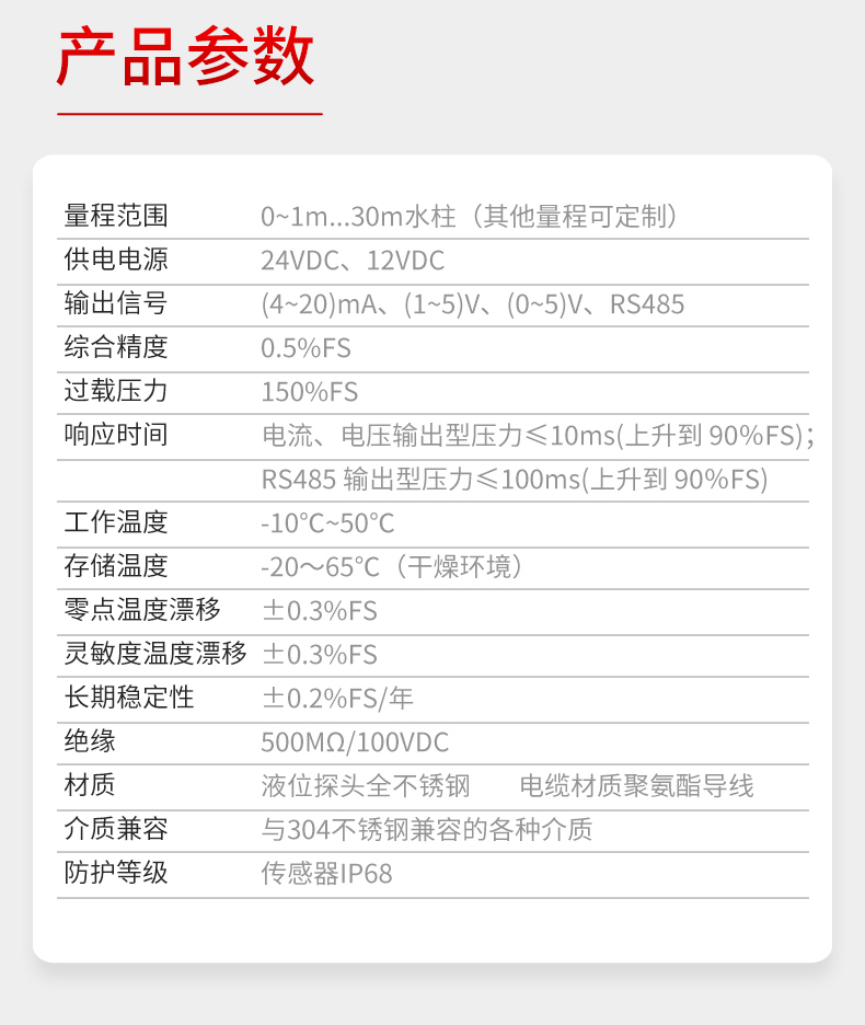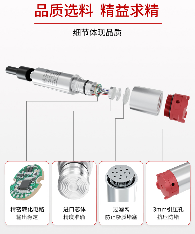 产品描述:投入式液位变送器由高性能扩散硅压阻式压力传感器作为测量元件,把与液位深度成正比的液体静压力准确测量出来,并经过信号调理电路转换成标准(电流或电压)信号输出,建立起输出信号与液体深度的线性对应关系,实现对液体深度的测量。产品精度高、体积小,直接投入液体中,即可测量出变送器末端到液面的液体高度,使用方便。适用于石油、化工、 电厂、城市供水、水文勘探领域的液位测量与控制。
