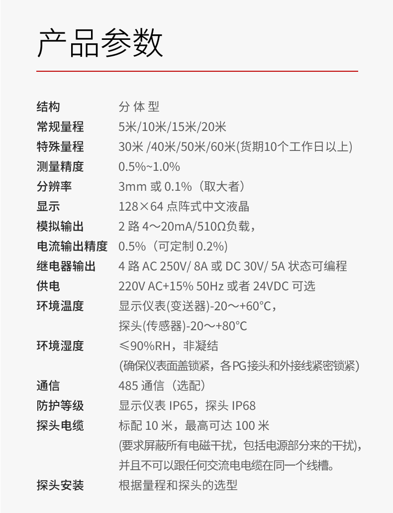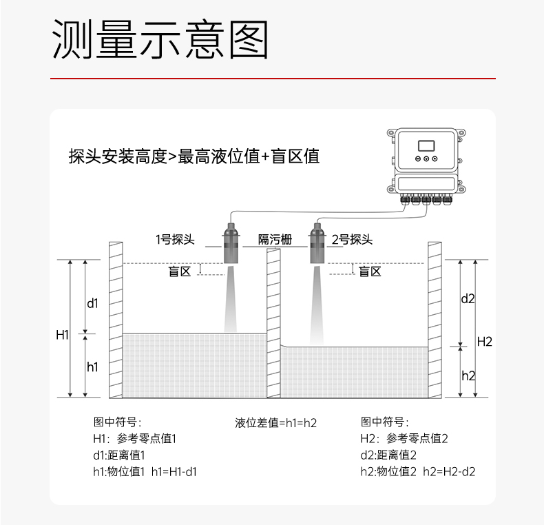 产品描述:超声波物位差计(料位,液位),是用来测量两个不同容器的液位 或者料位之间的高低差别。