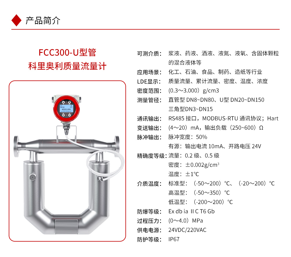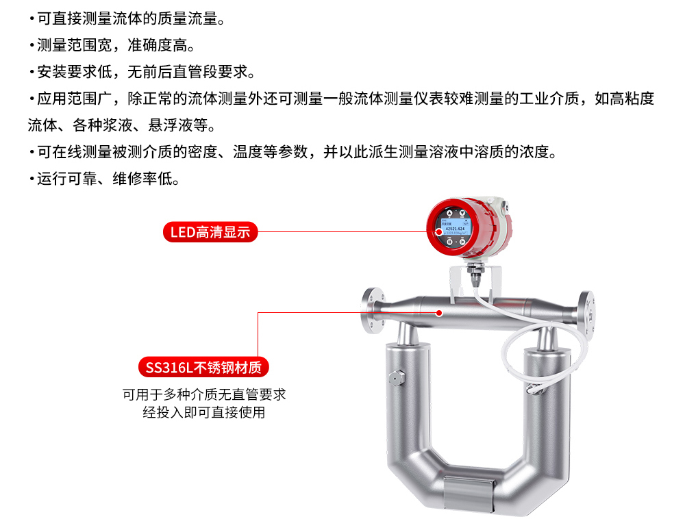 产品描述:科里奥利质量流量计是根据科里奥利力原理开发的一种新型的流量测量仪表,可直接测量封闭管道内流体的质量流量、介质的密度和温度。可广泛应用于化工、石油、食品、制药、造纸等行业