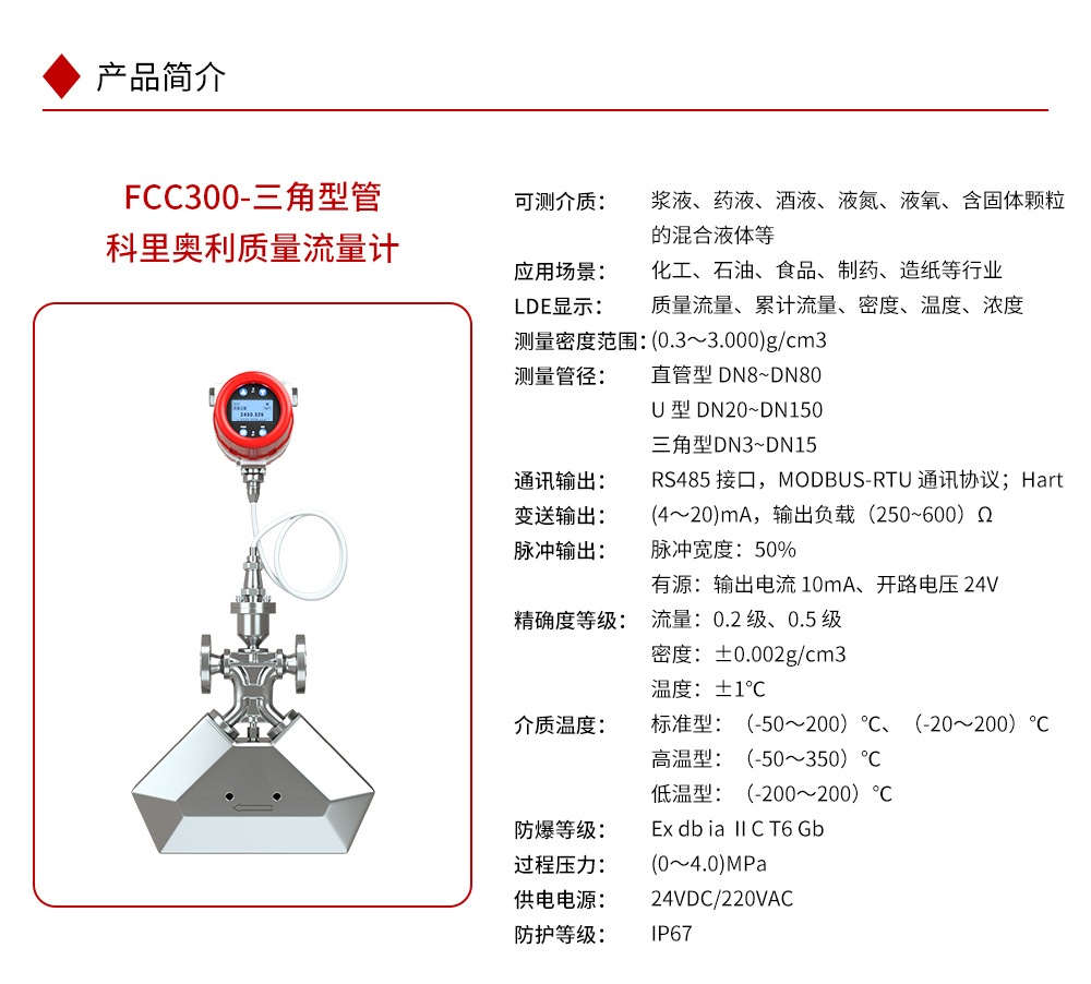 产品描述:科里奥利质量流量计是根据科里奥利力原理开发的一种新型的流量测量仪表,可直接测量封闭管道内流体的质量流量、介质的密度和温度。可广泛应用于化工、石油、食品、制药、造纸等行业