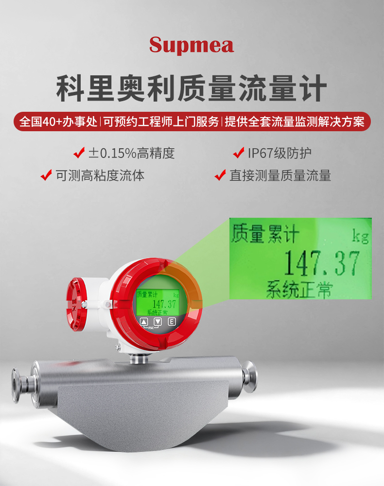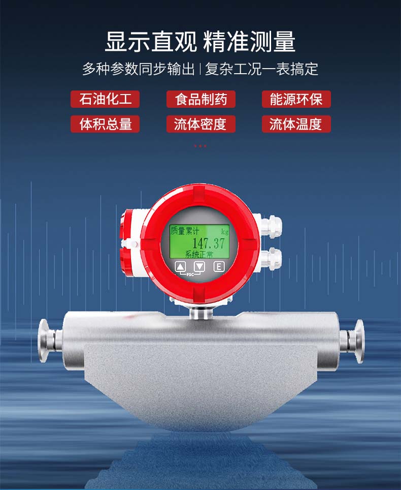 产品描述:科里奥利质量流量计是根据科里奥利力原理开发的一种新型的流量测量仪表,可直接测量封闭管道内流体的质量流量、介质的密度和温度。可广泛应用于化工、石油、食品、制药、造纸等行业。