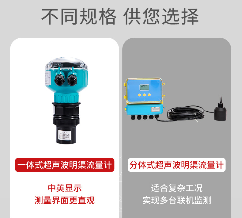 产品描述:超声波明渠流量计与量水堰槽配合使用,测量明渠内水的流量。主 要用于测量污水厂、企事业单位的污水排放口、城市下水道的流量及农 田水利中的渠道等。