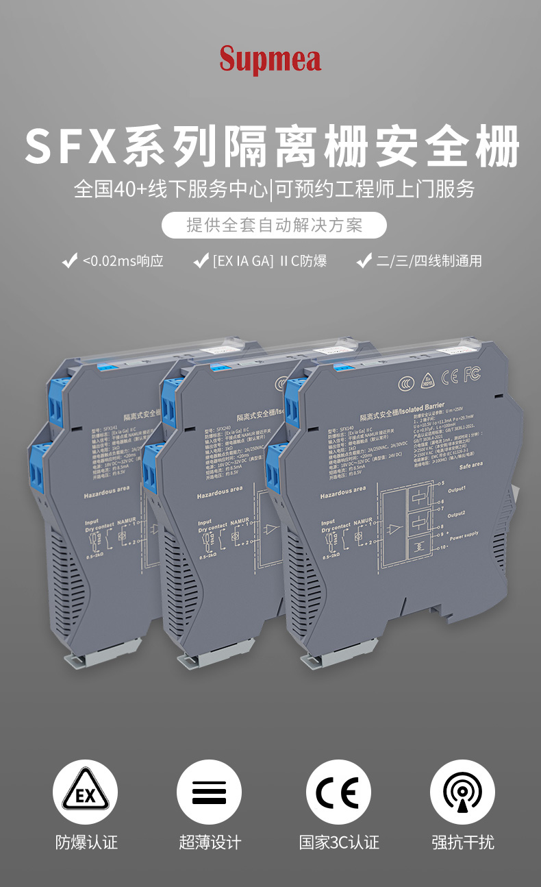 产品描述:隔离式安全栅向危险区的变送器提供隔离的工作电源,同时检测回路中的电流,经隔离变送输出电流或电压信号到安全区。