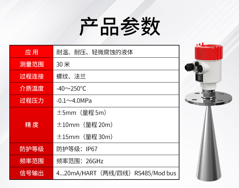 产品描述:90 系列传感器是 26G 高频雷达式物位测量仪表,测量最大距离可达 80 米。天线被进一步优化处理,新型快速的微处理器可以进行更高速率 的信号分析处理,使得仪表可以用于各种强腐蚀性液体的测量。CN5