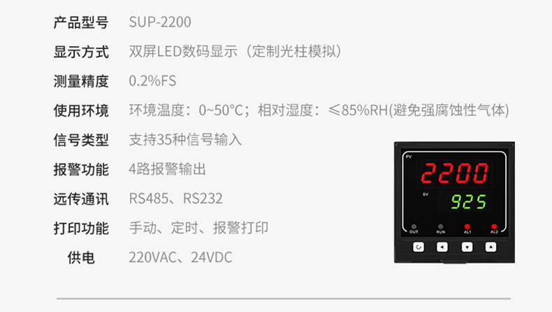 产品描述:美仪SUP-2200双回路数字显示控制仪采用了表面贴装工艺,全自动贴片机生产,具有很强的抗干扰能力。本仪表支持多种信号类型输入,可与各类传感器、变送器配套使用,实现对温度、压力、液位、速度、力等物理的测量显示,带报警控制、模拟变送输出、485/232 通讯等输出功能,带双屏数码管显示,可自由设定上、下窗口显示内容,可订制数学运算功能,可针对两路测量信号进行加、减、乘、除运算,其适用范围非常广泛。