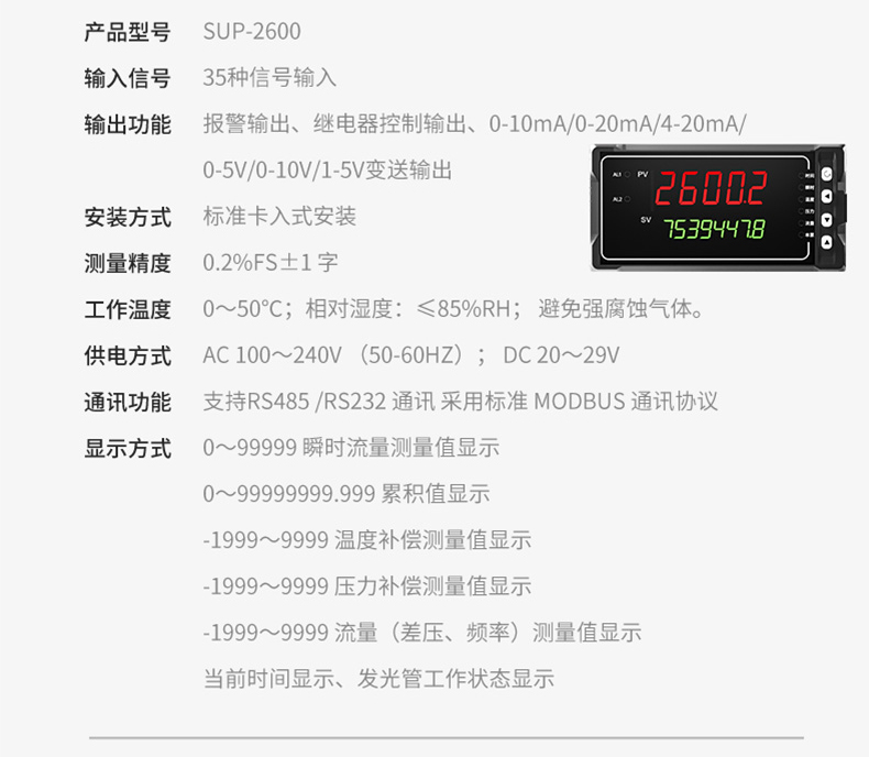 产品描述:美仪SUP-2600流量积算控制仪采用了表面贴装工艺,全自动贴片机生产,具有很强的抗干扰能力。本仪表针对现场温度、压力、流量等各种信号进行采集、显示、控制、远传、通讯、打印等处理,构成数字采集系统及控制系统,适用于液体、一般气体、过热蒸汽、饱和蒸汽等流量积算测量控制。