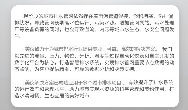 美仪解决方案已成功应用于多个城市排水项目,有效提升了排水系统的运行效率和管理水平,助力城市实现水资源的科学管理和节约使用,打造水清河畅、生态宜居的美好城市