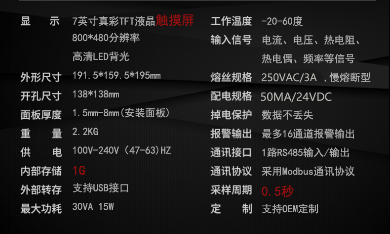 产品描述:触摸式彩色无纸记录仪具有 60 个运算函数、24 路模拟量输入、3 路 开关量输入、3 路脉冲量输入、6 路模拟量变送输出、16 路开关量输出, 可实现运算、显示、记录、报警、分析统计报表、高速采样等功能,通 过 RS-232/RS-485 和以太网通讯接口,可实现远程实时监控、组态管理、 历史数据读取等功能,通过 U 盘可实现组态管理、监控画面管理和历史 数据管理等功能。