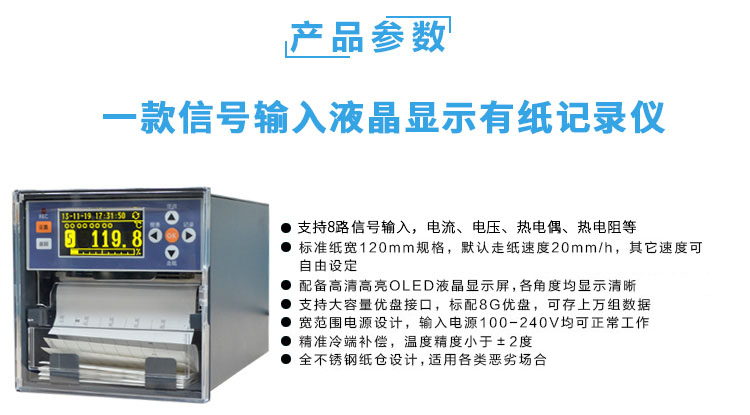 产品描述:混合式打印记录仪是专业针对工业现场设计的多功能智能记录仪。 提供多路高精度模拟信号输入通道,可配置多路报警,提供传感器配电; 采用高精度热敏打印机,实现数据、曲线和混合打印;配备有高亮高清 晰 OLED 液晶屏,提供实时数据显示。