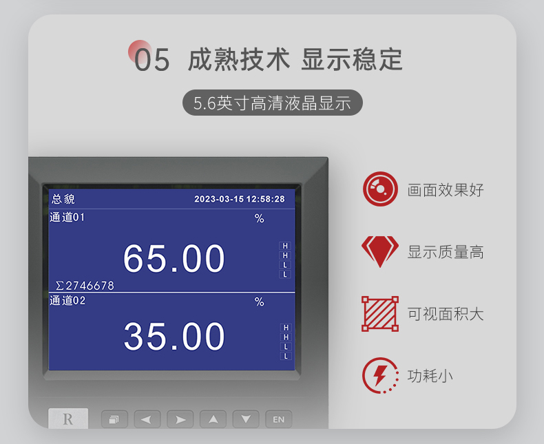 产品描述:SUP-R4000D系列无纸记录仪是一种高速高性能微处理器和5.6英寸彩色液晶显示屏,对现场各种温度、压力、流量、电量等信号实现监测、控制和记录功能。 SIN-R4000D系列无纸记录仪可自由组态输入标准电流、标准电压、热电偶、热电阻、频率等信号,可实现为传感器配电和继电器报警输出,并且可通过U盘或通讯方式与上位机进行数据交换。