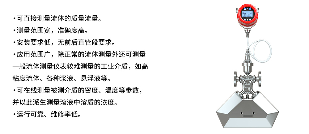 产品描述:科里奥利质量流量计是根据科里奥利力原理开发的一种新型的流量测量仪表,可直接测量封闭管道内流体的质量流量、介质的密度和温度。可广泛应用于化工、石油、食品、制药、造纸等行业